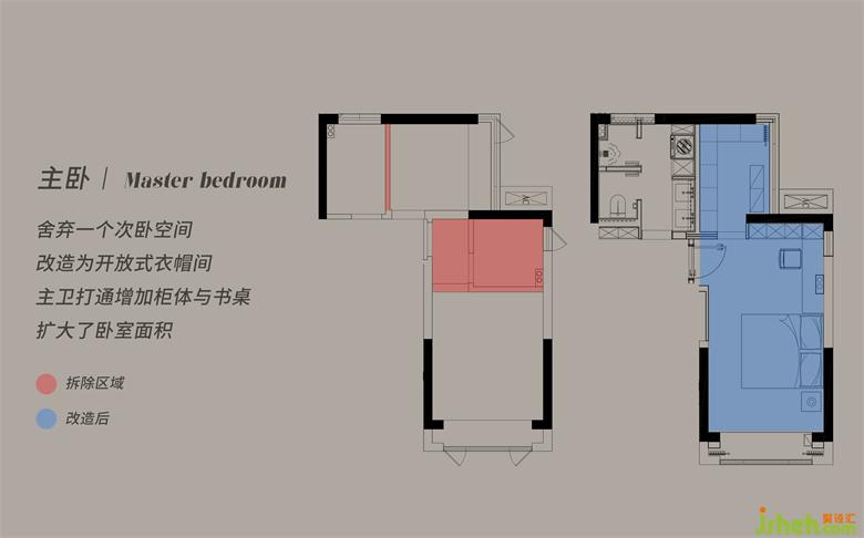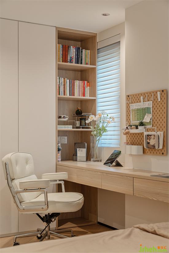 將原本的主衛(wèi)空間打通后,主臥擴(kuò)容到了15.8㎡,并順勢(shì)定制了一面書(shū)桌和柜體作為收納補(bǔ)充,整合后的臥室溫暖舒適,家裝設(shè)計(jì)營(yíng)造出柔和溫潤(rùn)的氛圍。