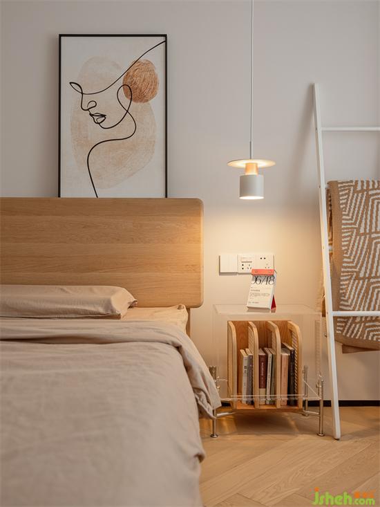 木質(zhì)家具搭配咖色床品帶來(lái)舒緩文藝的氣息。家裝設(shè)計(jì)隨著一天的結(jié)束,屋主會(huì)利用書(shū)桌將工作和日常事宜記錄總結(jié)在洞洞板上,自律認(rèn)真的人,總是能在生活中收獲自在與喜樂(lè)。