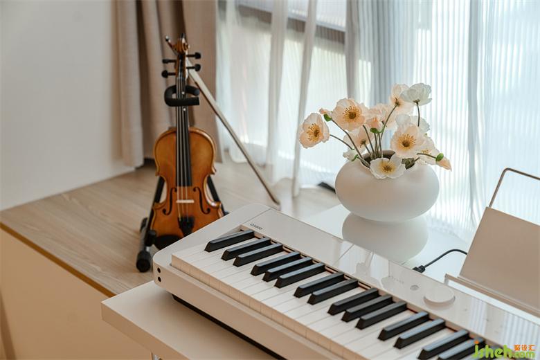 多數(shù)家庭的飄窗都會(huì)淪為衣物堆砌的地方,實(shí)用性大打折扣,所以這里利用3㎡的飄窗區(qū)域+定制桌面, 作為女兒的琴房。家裝設(shè)計(jì)加上大地色系的窗簾和室內(nèi)呼應(yīng),搭配一些甜美的可人的花束更是倍添姿色。