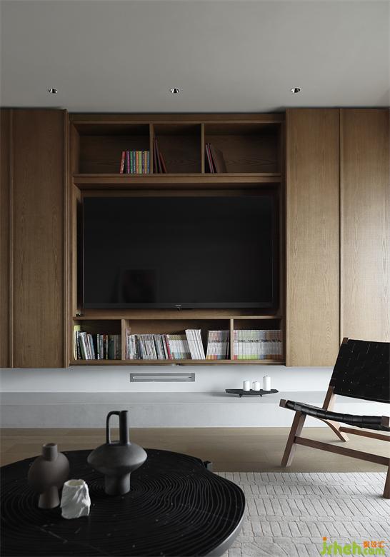也放棄了原本安裝投影幕布的想法,家裝設(shè)計利用開合式柜體將電視“隱形”,足夠的收納面積,也方便了兩個孩子的大量讀物的擺放,維持空間秩序的整潔。