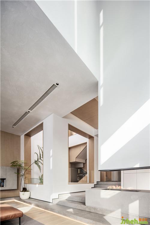 通過穿插新的建筑體塊,將原本只有兩處光線可以影響到室內(nèi)部分的情況下,又增添了一處陽光可以直接進入到房子最核心的部分。玻璃頂下方增加了一層穿孔鋁板,賦予光線進入的過程另一種儀式感。