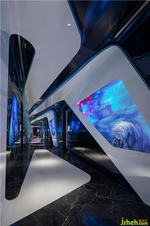 使用烤漆鋁板、鏡面不銹鋼和LED異形屏的結(jié)合,并以連貫的線條燈光作為導(dǎo)引,提取未來感、撕裂再重構(gòu)的元素縱橫貫穿了整個(gè)走廊。