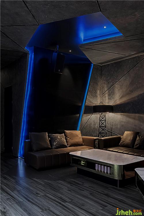 抽象結(jié)構(gòu)山的形態(tài),陡峭險(xiǎn)峻、結(jié)構(gòu)交錯(cuò),引人征服,深灰色毛石面和冷色調(diào)燈光相互呼應(yīng),咖色皮質(zhì)沙發(fā)、暖色燈光則提升整體空間的張馳度。