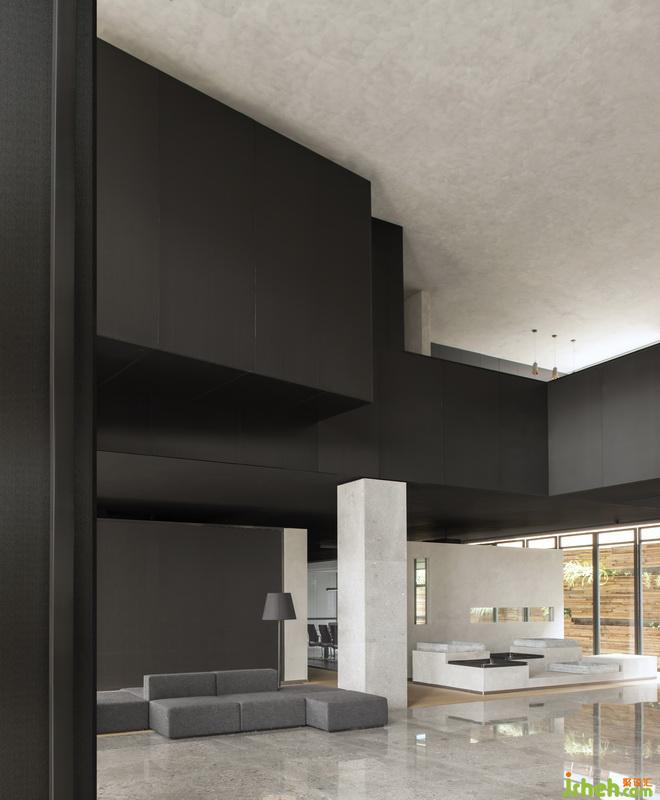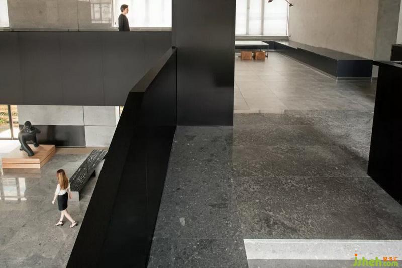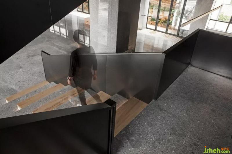 將原有建筑結(jié)構(gòu)幾何圖案,在形態(tài)上伸展變化,樓梯與天橋一貫而成,黑色拉絲不銹鋼隔板的運(yùn)用,把每一個(gè)簡(jiǎn)單幾何案變?yōu)橛械袼芨械淖髌罚臻g連接功能的實(shí)用性與藝術(shù)性的融合,讓視角空間有了靈動(dòng)。