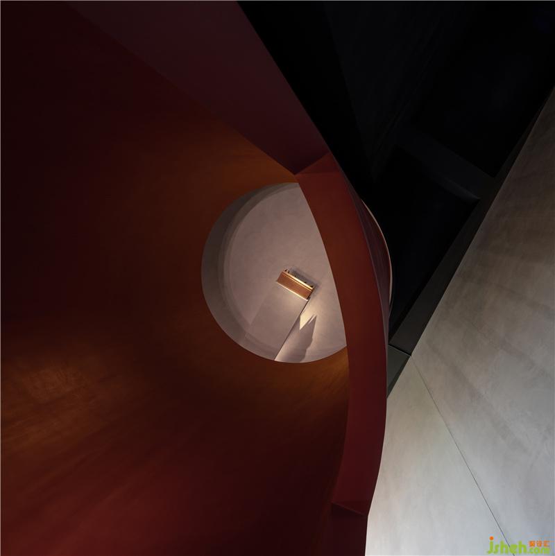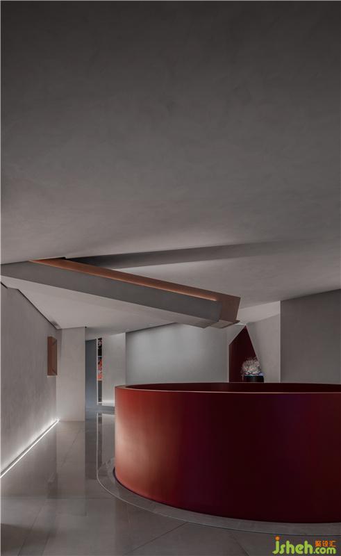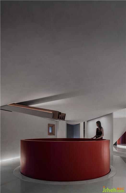 梯、方、圓,形態(tài)各異的體塊,錯落疊合。入口設計在隱于方形體塊一側,佛山辦公室設計無任何裝飾的水泥灰白,有種猜不透的冷靜感,脫俗而低調(diào)的門面躍然而現(xiàn)。