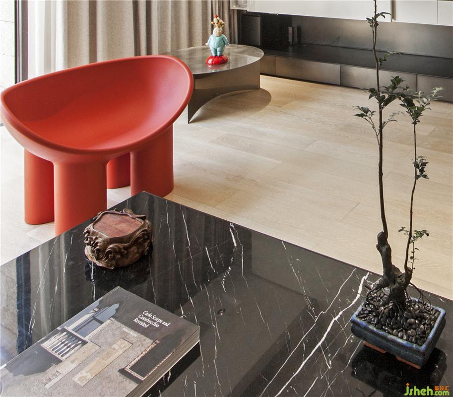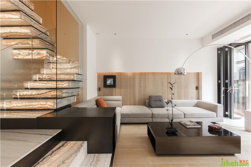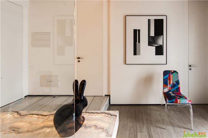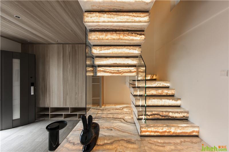 從一層開(kāi)始向上蔓延的樓梯成為別墅內(nèi)唯一的垂直動(dòng)線。為改善原有樓梯陡且窄的問(wèn)題,通過(guò)藝術(shù)塑造,使其成為屹立于整幢別墅里的巨型“藝術(shù)品”。光從玉石包裹中透出,柔和、溫暖,極大地弱化了原始樓梯給人的抗拒感,也成為空間的亮點(diǎn)。佛山別墅裝修設(shè)計(jì)在旁邊掛上一幅現(xiàn)代藝術(shù)畫(huà),隨意擺上一張?jiān)O(shè)計(jì)感的椅子,現(xiàn)代藝術(shù)格調(diào)充滿了空間。