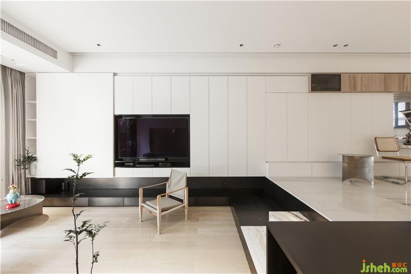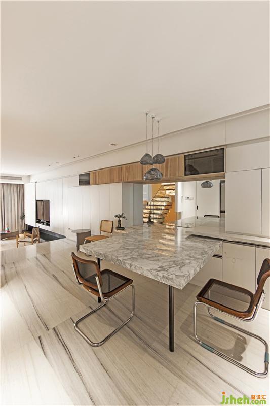 二層是家庭共享功能區(qū),在設(shè)計(jì)上,模糊廚房、餐廳、客廳和露臺(tái)的空間界限,采用全開(kāi)放的方式,使得自然與室內(nèi)融為一體。白色和木色作為室內(nèi)的主打色,簡(jiǎn)潔的天花和墻面,顯得空間更加明亮。佛山別墅裝修設(shè)計(jì)白色的電視背景柜從客廳到廚房連成一片,強(qiáng)化了空間的整體性,同時(shí)作為巨大的收納空間也提供了家庭所需的實(shí)用性。