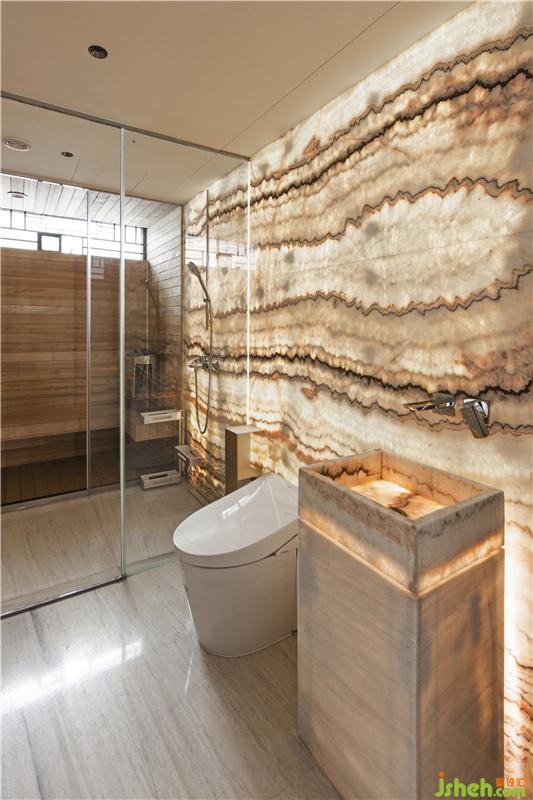 主人房的盥洗室沿用了樓梯的語(yǔ)言,玉石包裹的墻面和洗手臺(tái),別具一格,成為主人房私密空間的一大亮點(diǎn)。佛山別墅裝修設(shè)計(jì)與樓梯相同的布燈手法,自發(fā)光的墻面和洗手臺(tái),解決了室內(nèi)的照明問(wèn)題。柔和的光線讓臥室顯得更加溫馨和舒服。