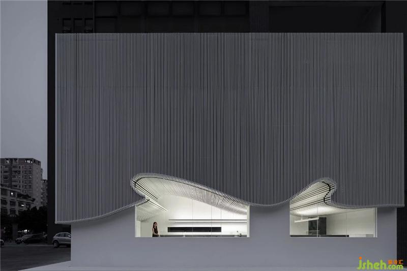 白色的鋁通管從建筑外立面的頂端拉至一層的天花,筆直的線條猶如織布機上一排排整齊細密的紗線,包裹著建筑。