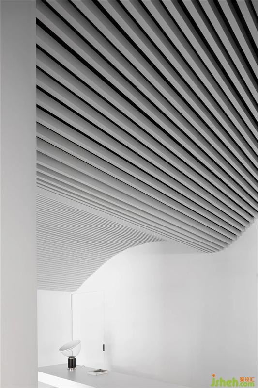 鋁通從二層建筑頂部平直的起點拉至一層后,調(diào)節(jié)不同的收尾長度在同一平面形成曲線,并與室內(nèi)的曲度一致,給人以建筑外墻的鋁通從建筑頂部一直貫穿至一層天花的即視感。