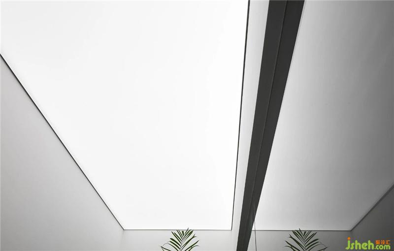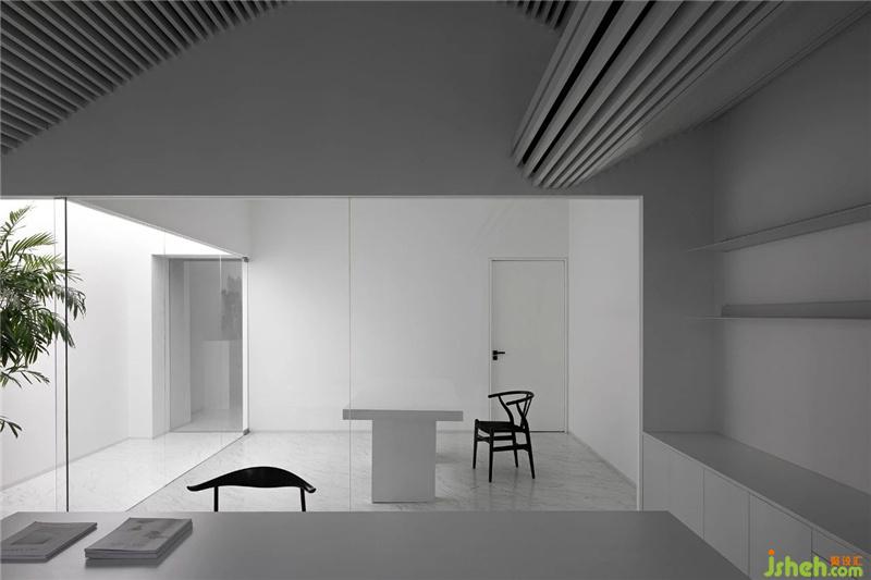室內(nèi)進(jìn)門左排依次是接待室和兩間獨(dú)立辦公室,最主要的問題是沒有采光和不通風(fēng)。設(shè)計師在這三間房的側(cè)邊間隔出一個通道,佛山辦公室設(shè)計用軟膜天花和人造光打造成一個如能透進(jìn)自然光的“天井”,解決采光問題。其次通道連接三間房,打開接待室的后門,風(fēng)可以直接從通道引進(jìn)另外兩間辦公室。