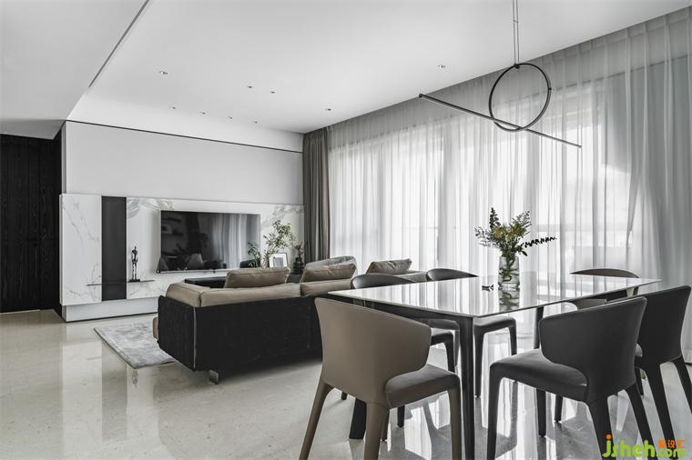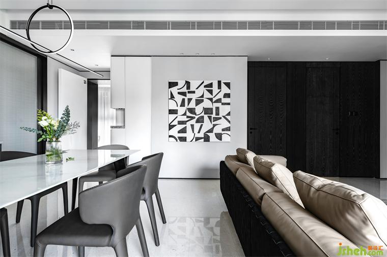 客餐廳作為家中最核心的區(qū)域,見證著這個家所有歡聚的時刻,華潤潤府裝修設(shè)計(jì)整個空間依然延續(xù)著黑白灰的主色調(diào),電視墻和餐邊柜在兼顧儲物的同時,也做了適當(dāng)?shù)牧舭滋幚?,給了空間更多的呼吸感。