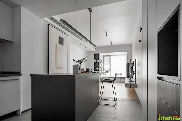 化繁為簡,空間打破原有閉塞的格局,家裝設(shè)計將客餐廚連成一體,半圍合式的客廳,休閑且隨性,餐廳島臺一字延伸,劃分出就餐區(qū),格局規(guī)整統(tǒng)一,黑白兩色構(gòu)建了整個空間,清晰而又生動。