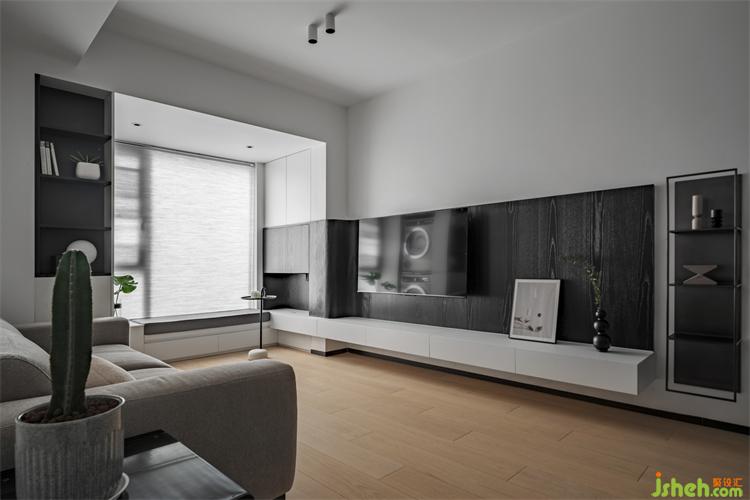 客廳以黑白色調(diào)鋪陳,更顯空間開闊通透,家裝設(shè)計休閑區(qū)的卡座延伸到電視柜,形成了半圍合式的空間形式,拉近了彼此間的距離,整面中空的黑色木飾面板穿插其中,打破空間的滯悶感,黑色的不銹鋼吊架與沙發(fā)旁的開放柜點綴其中,靈活而又生動。