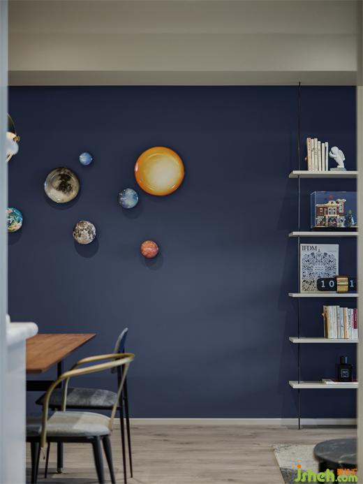 餐廳由一組來(lái)自意大利的seletti的星空掛鉤點(diǎn)綴其中,不規(guī)則的排列組合,裝修公司好似浩瀚宇宙中分布的各個(gè)星球。