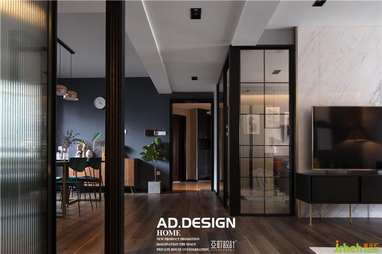 客廳黑灰色皮質(zhì)沙發(fā)結(jié)合墨綠色斯家蒙的單椅,與景觀陽(yáng)臺(tái)墨綠色窗簾及黑色馬賽克相呼應(yīng)。電視背景墻室內(nèi)設(shè)計(jì)師則用兩側(cè)透明的鐵藝玻璃隔斷,以及整面爵士白大理石構(gòu)成。這感覺恰如《重慶森林》的畫面,暗淡的光線,又被高光給予玻璃杯的質(zhì)感,溫熙慵懶。