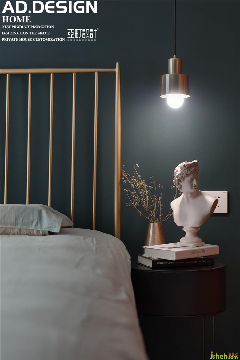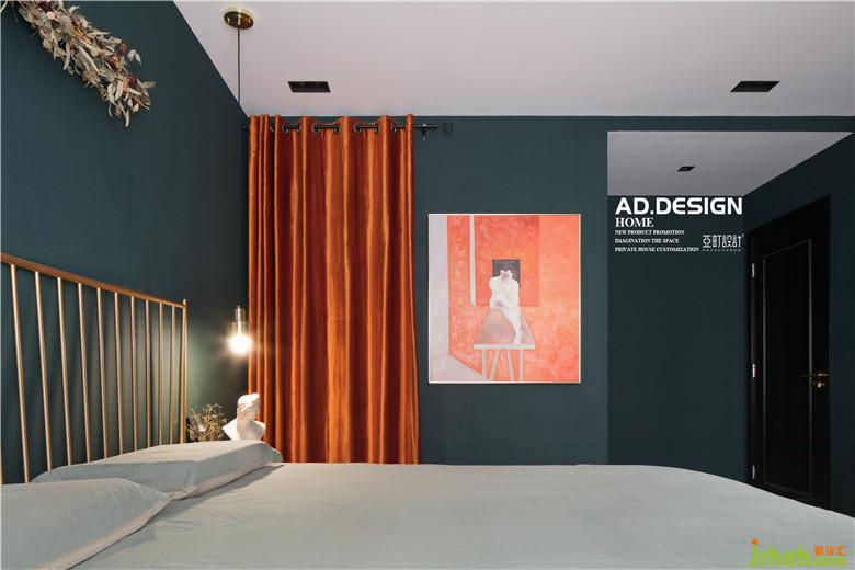主臥全房的乳膠漆顏色室內(nèi)設(shè)計(jì)師都采用暗沉?xí)崦恋哪G色,點(diǎn)綴些許杏紅色在窗簾布料以及裝飾畫上,搭配上金色的鐵藝雙人床,讓整個(gè)空間的軟裝配飾更加突出。