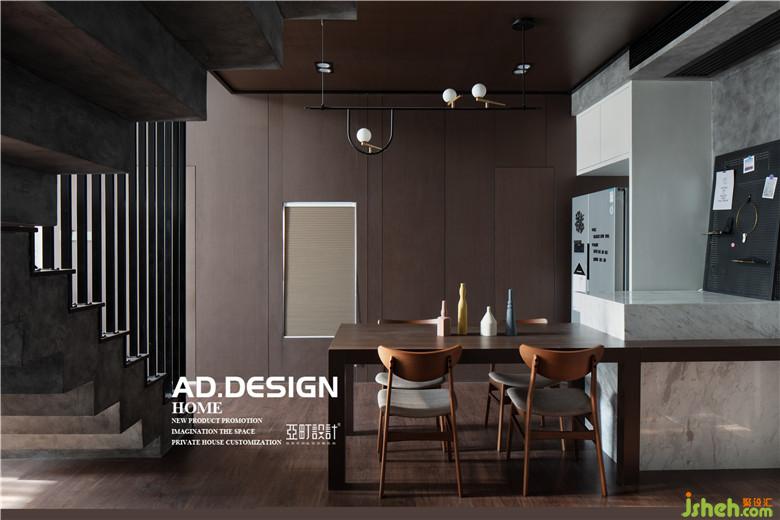 餐廳上方挑空搭建書(shū)房,跟客廳形成空間差。餐廳墻面跟頂面是同材質(zhì)的飾面板,整個(gè)飾面板里藏著兩扇隱形門(mén),居家空間里的小微妙。