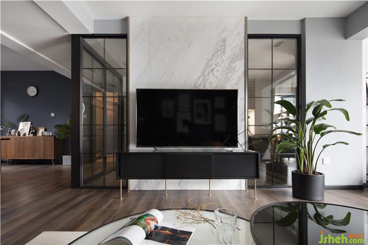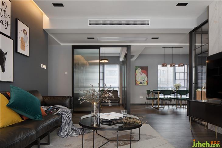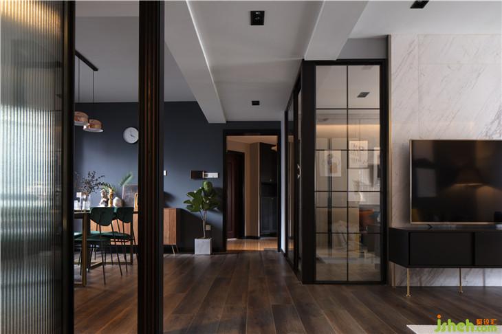 客廳的黑灰色皮質(zhì)沙發(fā)結(jié)合墨綠色的斯家蒙的單椅,與景觀陽(yáng)臺(tái)的黑色馬賽克以及墨綠色窗簾相呼應(yīng),而電視背景墻則是由兩側(cè)透明的鐵藝玻璃隔斷與中間整面爵士白大理石構(gòu)成,玻璃隔斷使客廳與廚房間隔開(kāi)來(lái),滿足了廚房因窗戶小采光不夠而增加了的兩側(cè)采光,而大理石則遮擋了背面廚房的西餐操作臺(tái),增加了廚房的操作臺(tái)面的需求,又讓客廳因這面電視背景墻而更加生動(dòng)。