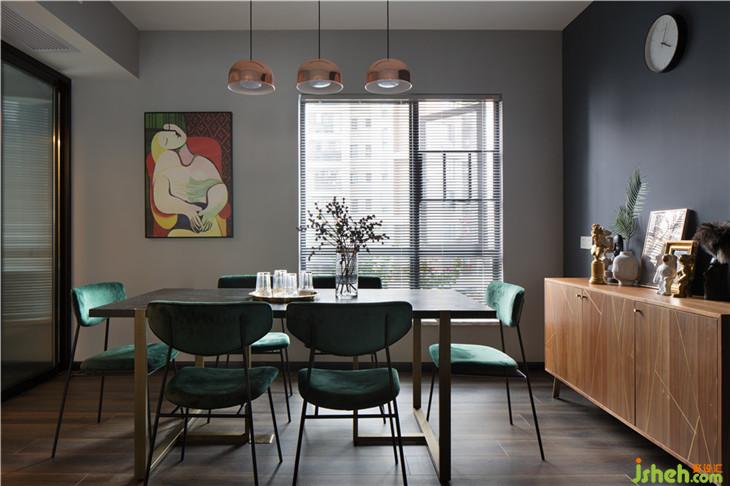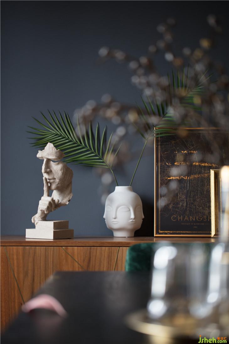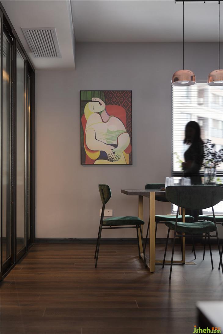餐廳的餐邊柜墻面的煙灰藍(lán)與客廳的沙發(fā)背景墻遙相呼應(yīng),長方形的八人餐桌搭配墨綠色餐椅滿足日常以及有客人到來的時(shí)的需求,而從客廳面對餐廳的墻上掛著一幅畢加索的《夢》,則是整個(gè)餐廳的點(diǎn)睛之筆,這幅畫不僅僅是作為提升整個(gè)空間的藝術(shù)氛圍而使用。畢加索用最簡單的繪畫表現(xiàn)出了一個(gè)在夢境和現(xiàn)實(shí)中的少女,心形的臉,是熱戀中愛的寫照。當(dāng)年,47歲的畢加索與長著一頭金發(fā)的17歲少女初次相遇,從此,這位少女便一直成為畢加索繪畫和雕刻的模特。又過17年,64歲的畢加索給她的生日賀信中說:“對我來說,今天是你17歲生日,雖然你已度過了兩倍的歲月。在這個(gè)世界上,與你相遇才是我生命的開始?!蓖瑯拥?,徐小妞與陸先生的初次相遇,也是作為陸先生攝影的模特,也許畢加索的這段話,正是陸先生要對徐小妞想要說的最溫暖的情話。