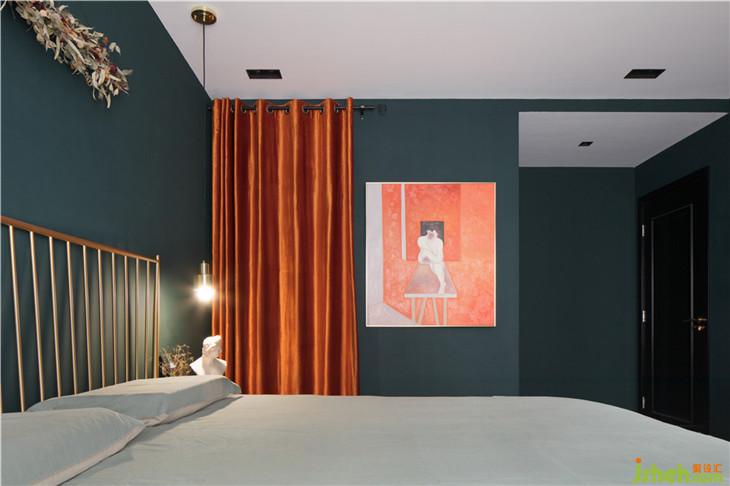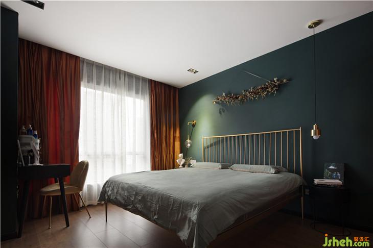 主臥全房的乳膠漆顏色都采用暗沉?xí)崦恋哪G色,點(diǎn)綴些許杏紅色在窗簾布料以及裝飾畫上,搭配上金色的鐵藝雙人床,讓整個(gè)空間的軟裝配飾更加突出。而杏紅色的窗簾背后則是通往衣帽間以及衛(wèi)生間的過道。
