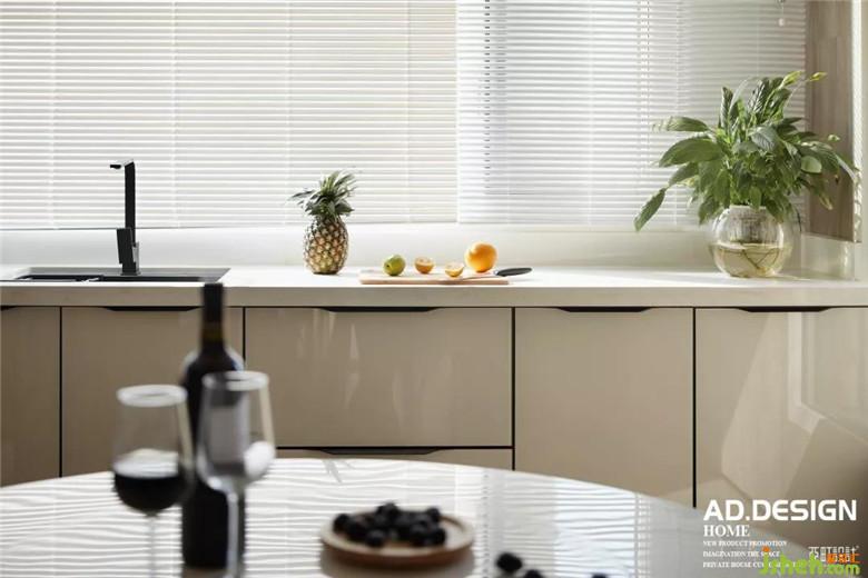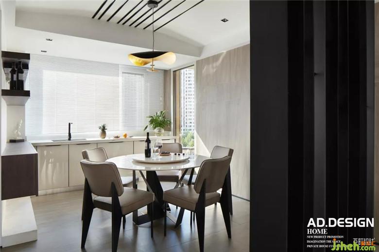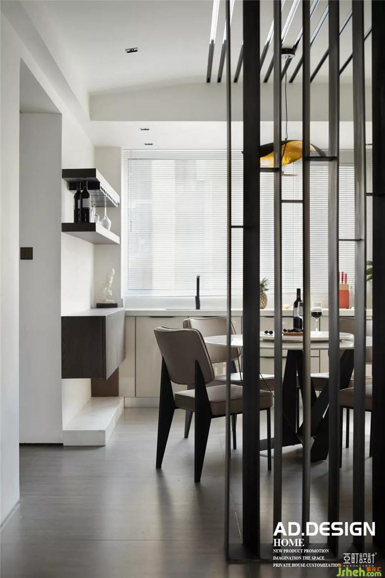 鋼板隔斷鱗次櫛比的佇立在餐廳中央,頂面的不銹鋼線條與其自然銜接,L型流線在整個餐廳里自然而然的舒展。白色玻璃櫥柜、灰色磨砂磚墻面交錯組合的鋪設(shè),豐富了整個空間的層次感。