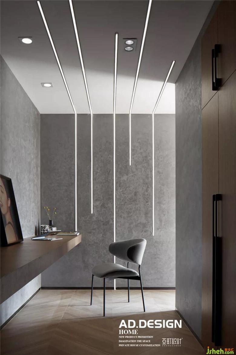 二樓迎面是最受業(yè)主喜歡的游戲室,超長的書桌充分滿足業(yè)主想要兩人同時在此玩游戲的訴求,甚至在有朋友到訪時能組團來個“開黑”。裝修公司從墻到頂?shù)木€型燈的設計更渲染出極具個性的空間活力,形成屬于此空間獨特的光美學。
