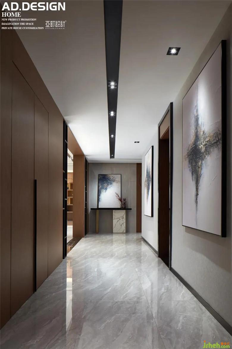 ▲玄關 | 整面通透的大理石方磚與木面開放柜穿插,進門即可感受簡練優(yōu)雅的氛圍。大理石邊桌與意境掛畫組成的玄關端景,沉穩(wěn)且高級。