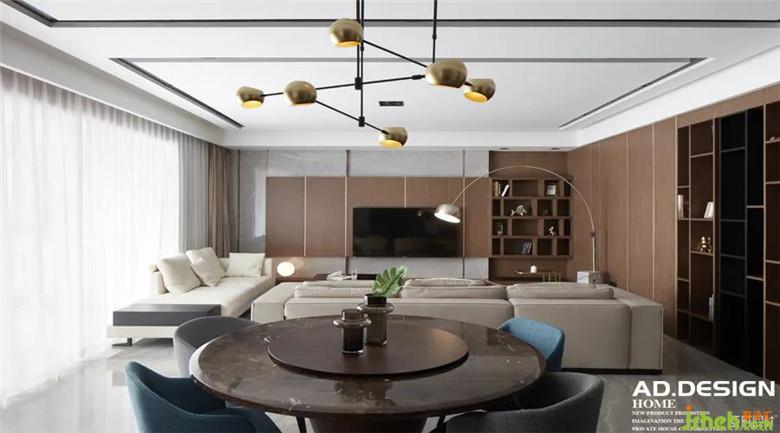 ▲客廳 | 裝修公司采用縱向布局,開放的空間舒展連續(xù),視野也變得更為廣闊通透。電視墻以大理石為背景拼接木質(zhì)的收納柜,體塊錯落有序,消彌空間大塊木色調(diào)所帶來的厚重。