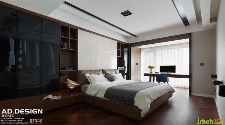 ▲主臥 | 大塊的落地窗,采光充足。沉靜質(zhì)樸的木紋飾面蔓延著悠然靜謐的氣息。床頭裝修公司采用的淺米色塊點破了整面墻體的暗調(diào),豐富了空間的視覺層次。窗邊的原木書桌點綴藍色凳椅,體塊干凈利落,質(zhì)感純粹不失活潑。