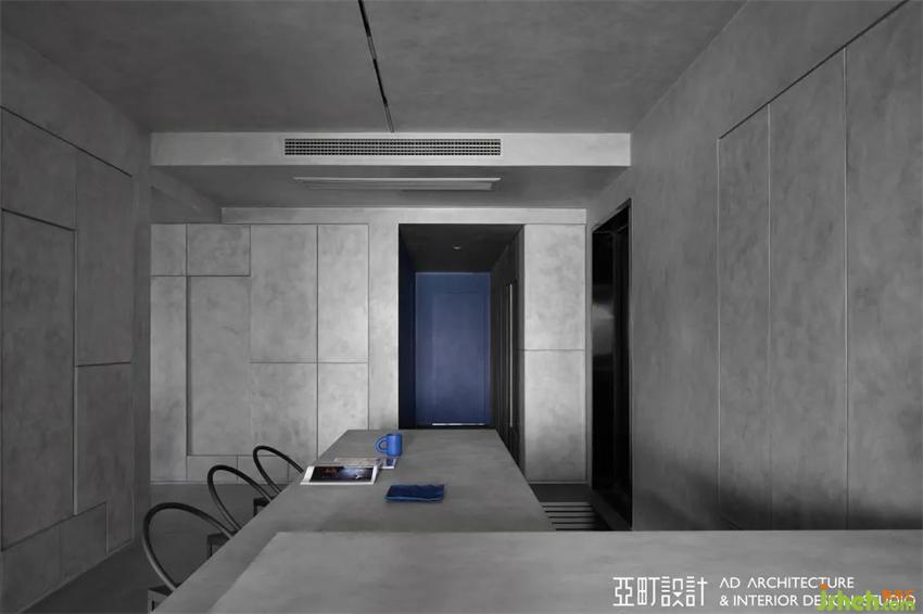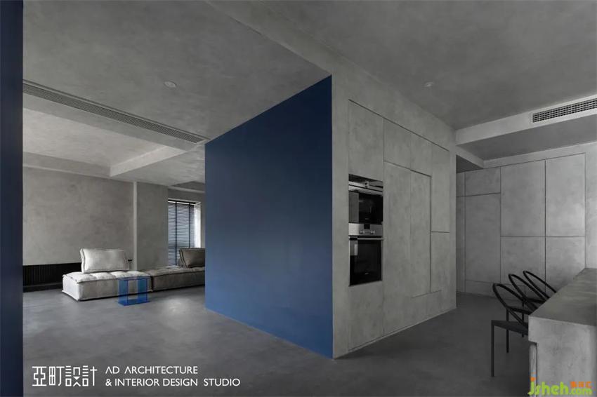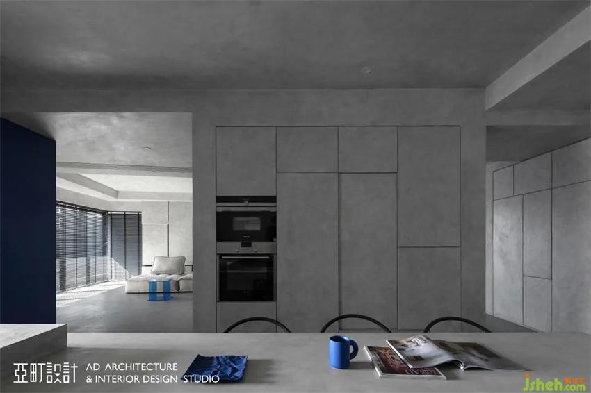 踱步至餐廳區(qū)域,莫奈灰主導(dǎo)著空間情緒,搭配純粹的克萊因藍(lán)擺件,一種特立獨(dú)行的時(shí)尚感油然而生。