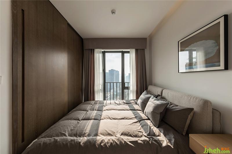 沿用公共區(qū)的簡介,臥室的軟裝部分,用深咖及灰調(diào)子營造出溫馨的環(huán)境深圳樣板房設(shè)計(jì)。