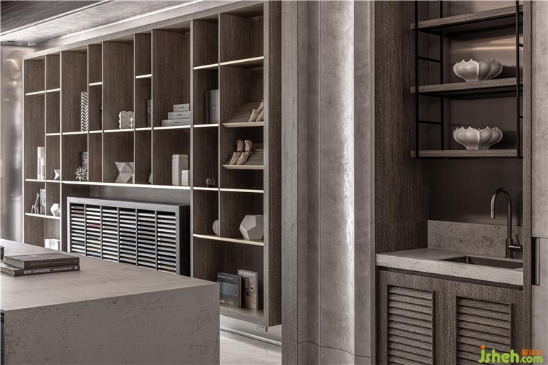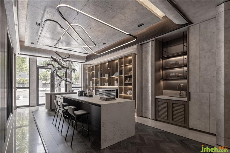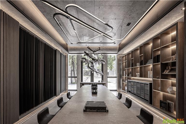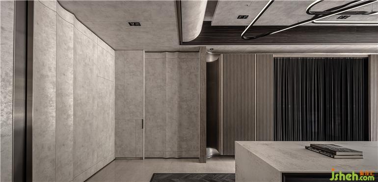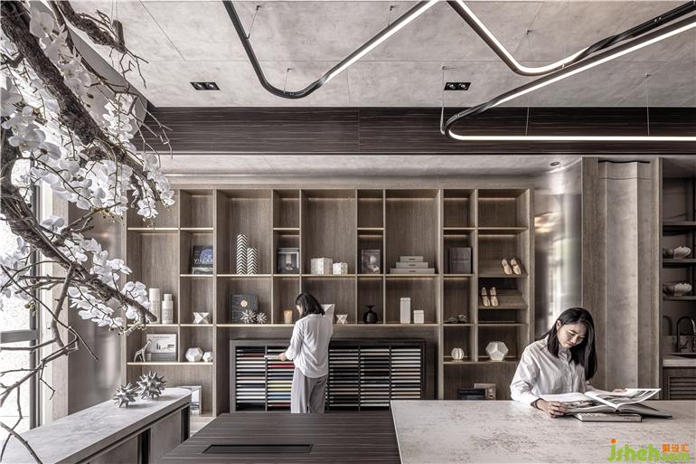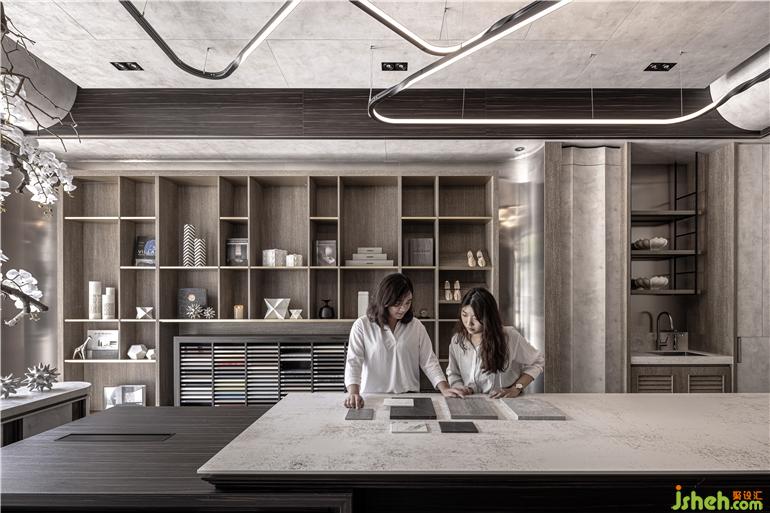 細(xì)致花藝揭開(kāi)美好空間序幕,溫潤(rùn)木質(zhì)感結(jié)合柔美燈光營(yíng)造適意氛圍,而理性石材的豐美肌理與觸感,則表現(xiàn)出細(xì)膩光澤和視覺(jué)層次。展廳設(shè)計(jì)以天花上兩弧形造型為出發(fā)點(diǎn),將8mm的系統(tǒng)板材以薄背切、彎折的方式達(dá)到曲線效果和折線造型,再延伸至墻面,巧妙發(fā)揮系統(tǒng)板材的可能性、重新定義也突破既有印象,實(shí)現(xiàn)工藝精神與設(shè)計(jì)構(gòu)想,打造出飽滿質(zhì)感卻自由無(wú)束的獨(dú)特樣貌。