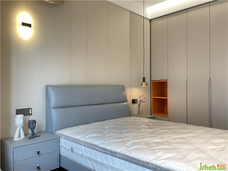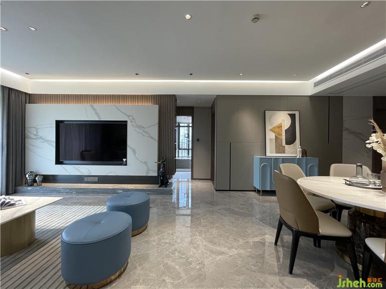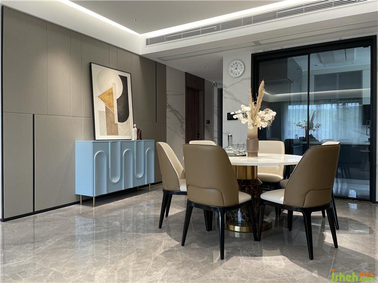 本套方案位于深圳?星河銀湖谷,業(yè)主給我們印象最深的是他每次談方案,身邊始終帶著他的寵物狗--法斗,主人在忙的時候,它總能靜靜的待在旁邊,就像形影不離的朋友,也充分說明業(yè)主充滿愛心的秉性,業(yè)主還是一位年輕沉穩(wěn)的企業(yè)家,對生活有自己的追求和要求,所以在家居的風(fēng)格上也是選擇更加沉穩(wěn)的色調(diào)和材質(zhì)來展開設(shè)計。打通生活陽臺,將廚房設(shè)計成大U型格局,將主衛(wèi)對面的小空間設(shè)計成衣帽間+書房的組合,實現(xiàn)主臥套房的設(shè)計,給業(yè)主更多的私密和享受空間。深圳家居設(shè)計在大面積的木飾面中,加入隱形門的設(shè)計,用于營造私密空間,起到隔絕視線,增加空間感的裝飾效果,鑲嵌黑色不銹鋼凹槽裝飾,與米白硬包碰撞,不同材質(zhì)之間把控得恰到好處,無絲毫凌亂突兀,反而將層次感展現(xiàn)得淋漓盡致。電視背景墻木格柵打底,巖板做背景結(jié)合黑色不銹鋼,采用對比的手法,木的溫潤細(xì)膩,巖板的清冷硬朗,黑色不銹鋼板的神秘,不同的材質(zhì)都在它自己的位置發(fā)揮自己僅有的氣質(zhì),用最簡單的方式呈現(xiàn)出最不一般的本質(zhì)。硬包本身就是一種溫潤且大方的材質(zhì),其不規(guī)則的拼貼方法,干凈利落的線條,讓本單一的溫馨高級氛圍感變得簡潔且有趣味性,淺藍(lán)色餐邊柜加入弧線做凹凸造型,融入金屬地腳,內(nèi)斂低調(diào)但不缺精致,正是這細(xì)微之處的裝點升華了空間。