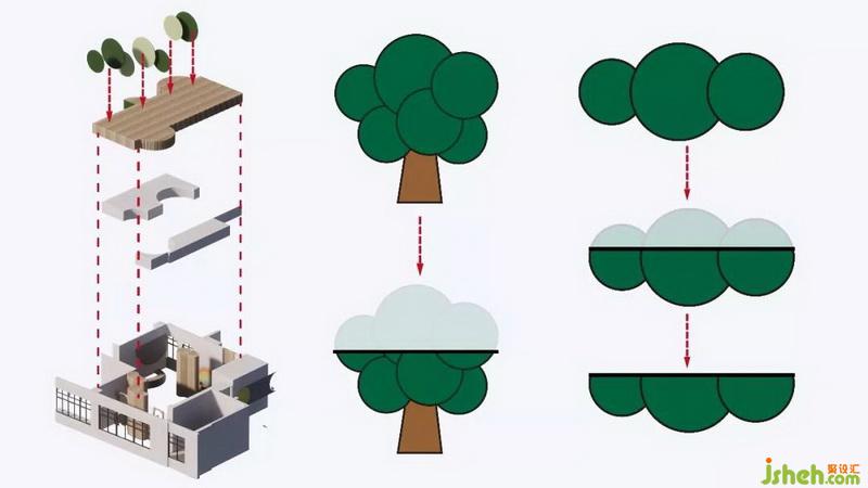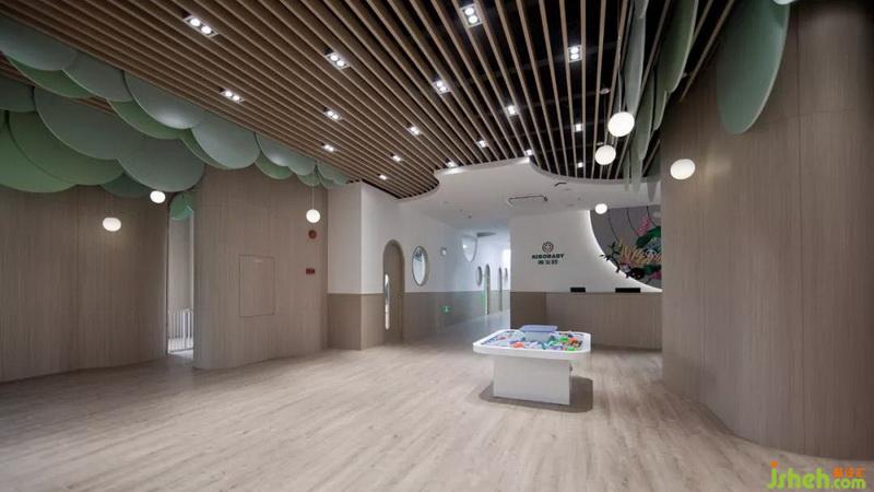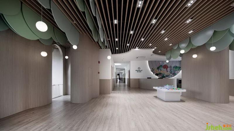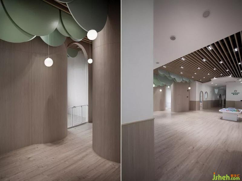 圓的元素在空間中的表達,比其他的圖形都更加有意義。學者伊麗莎白·闊特對肯尼亞兒童和成人的研究,因格瑞德和斯文安德森對納米比亞黑巴部落成員的研究,都證實了這個觀點。兒童涂鴉期出現(xiàn)的圓形,往往被賦予了“人”的意義。孩子“最初畫出的真正表征性的形狀就是圓形和橢圓形”。“因為圓形的簡潔和完美,人的視知覺就會把它挑選出來,對它產(chǎn)生偏好”。設(shè)計師把大樹的元素抽象簡化后,提取圓形幾何圖形,為營造參天大樹的視覺感受,特意把圓形截取部分融入在天花里面,以小孩的視覺感受出發(fā),只看到大樹的下半部分,形成猶如幾棵參天大樹聳立云霄的視覺感受。