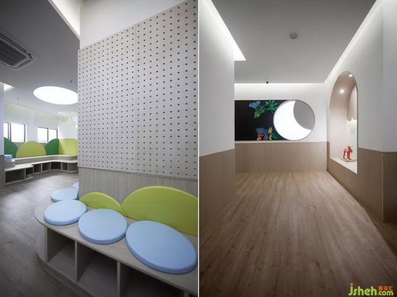 在其他空間的設(shè)計上同樣延續(xù)圓形的形狀去探索與孩子們的交流,希望能夠讓孩子們更快地去融入到這個空間里面;營造出像孩子們自己的家同樣的親切愉悅感受。在課室的墻上把教學黑板通過簡煉的幾何圖形設(shè)計,拉近空間環(huán)境與孩子們的心理距離。
