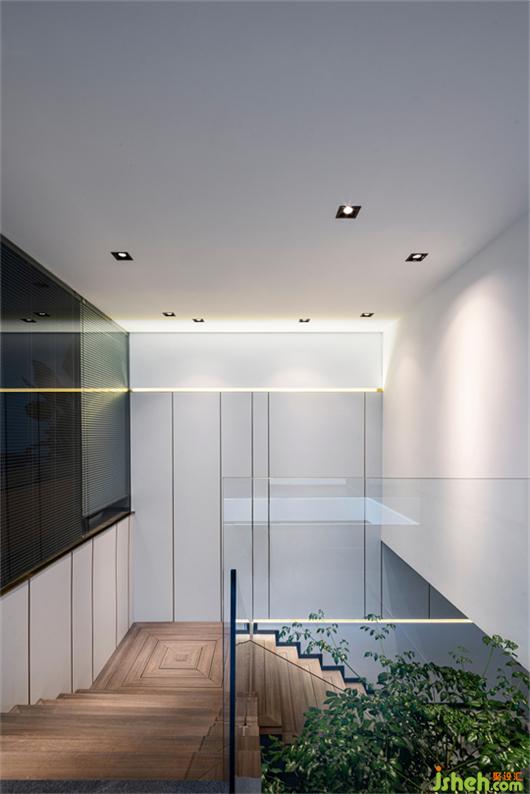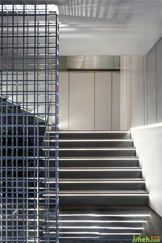 事務(wù)所設(shè)計(jì)將玻璃覆蓋樓梯側(cè)保障安全性的同時(shí)也可以將木踏面的精致和諧之美傳遞到公共空間中,自然綠色植物設(shè)計(jì)在樓梯邊的空間延伸到二樓,增加空間的通透性,同時(shí)打破自然與空間的界限。
