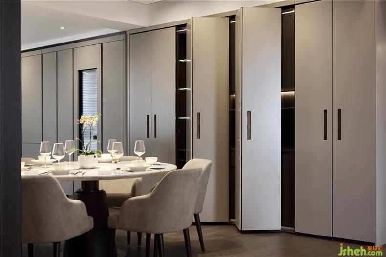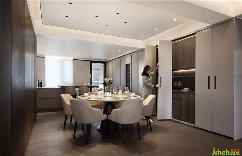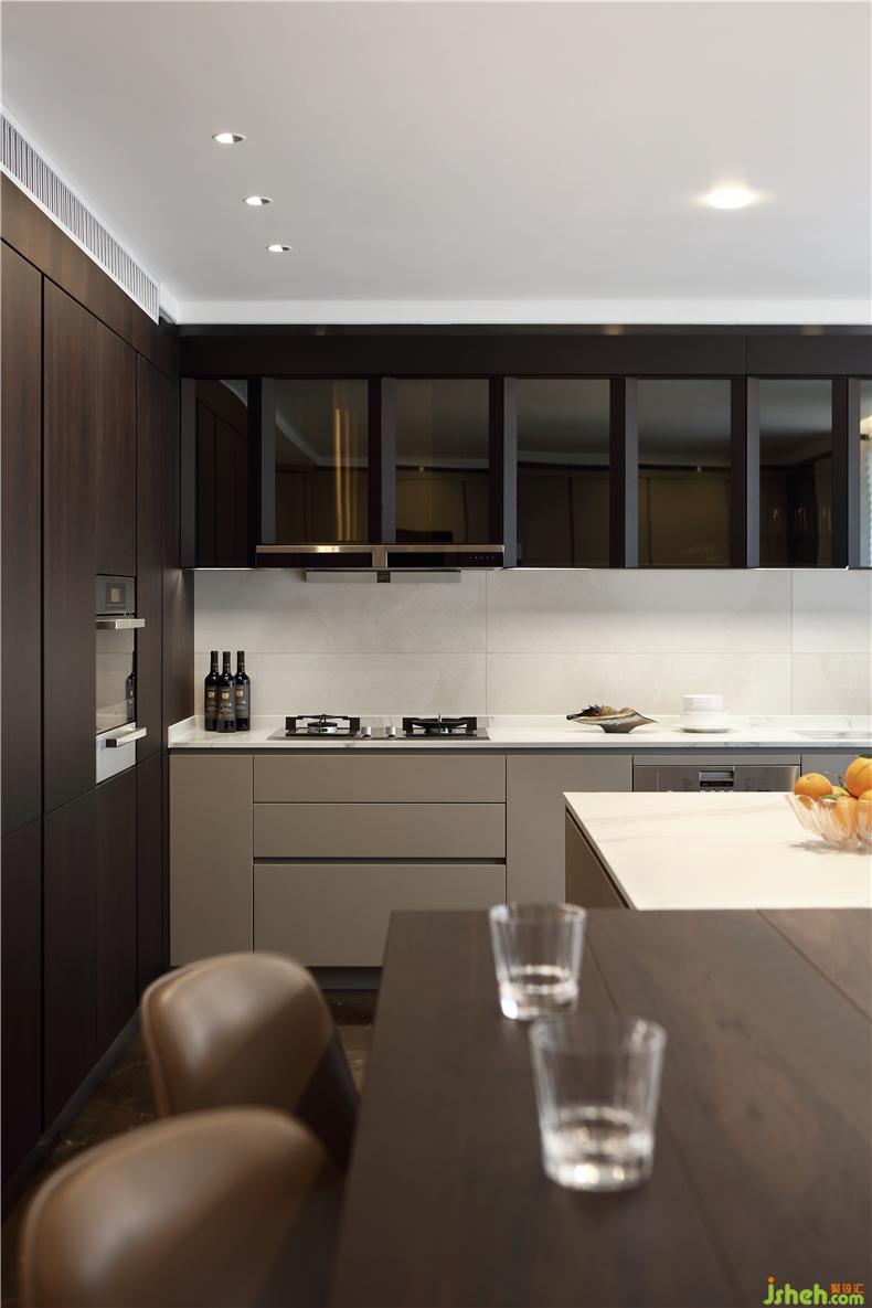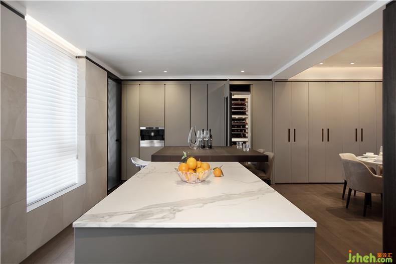 設(shè)計(jì)師打破常規(guī),在設(shè)計(jì)中把客廳、廚房、餐廳原有的分散空間進(jìn)行了巧妙的整合,室內(nèi)設(shè)計(jì)師化零為整,使得空間尺度得以放大,視野開(kāi)闊通透,低調(diào)質(zhì)感的家具點(diǎn)綴其間,克制典雅。原戶(hù)型客廳的開(kāi)間比較大有7米寬,而餐廳跟廚房相對(duì)來(lái)說(shuō)就顯得比較狹小,因屋主夫婦待在廚房的時(shí)間會(huì)比較多些,經(jīng)過(guò)溝通后,我們把原房間4的部分空間歸納為廚房,室內(nèi)設(shè)計(jì)師把廚房的開(kāi)間增加到跟客廳一樣大,擴(kuò)大廚房的同時(shí)我們?cè)黾恿艘粋€(gè)中島臺(tái),這個(gè)中島臺(tái)即可以當(dāng)作廚房操作臺(tái)來(lái)用,又可以當(dāng)作一個(gè)小吧臺(tái)。室內(nèi)設(shè)計(jì)師又為整個(gè)空間添加了一個(gè)亮點(diǎn)。