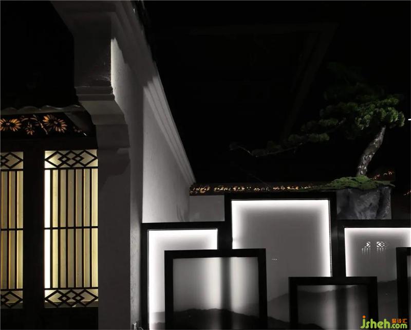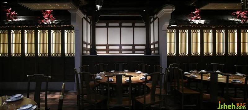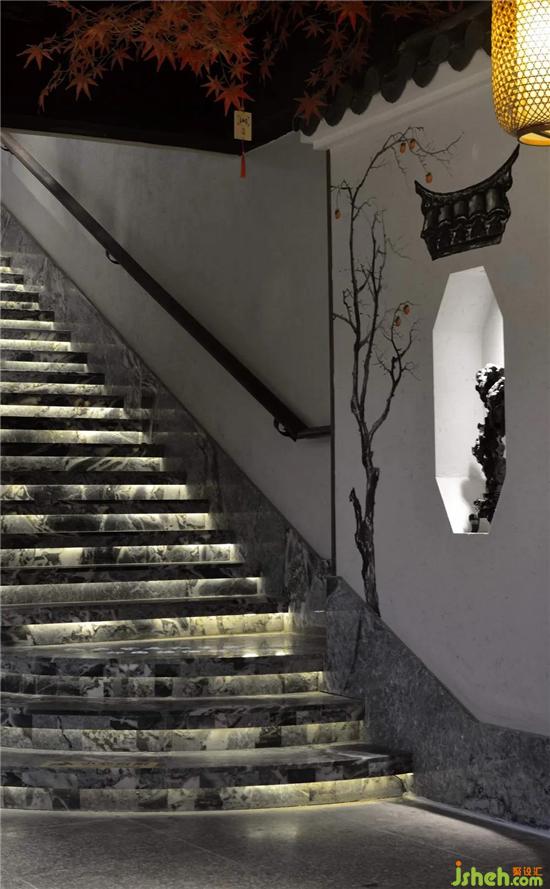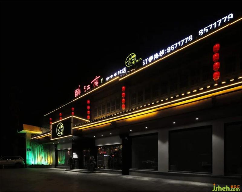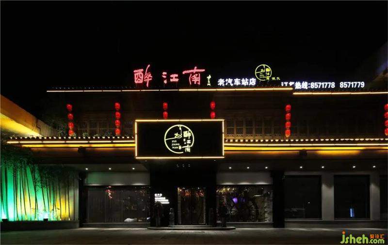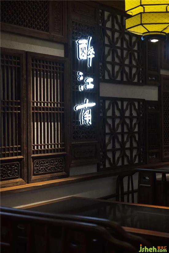 醉江南位于九江市潯陽(yáng)區(qū)原老汽車站前,隸屬老城中心區(qū)域這是一個(gè)二層建筑的改造,設(shè)計(jì)上取“江南”之意,著重體現(xiàn)中式建筑結(jié)構(gòu),將整體的用餐環(huán)境帶入江南的樓閣之中?!皹情w宜佳客”——南方建筑因氣候炎熱潮濕,所以一般以二層樓房居多,底層是磚結(jié)構(gòu),上層是木結(jié)構(gòu)。此次門頭的設(shè)計(jì),便是借鑒了這一特點(diǎn),一樓以外墻漆搭配石材及黑色不銹鋼,帶有寶瓶造型的玻璃門加上外墻大面積的玻璃設(shè)計(jì),即使站在門外也可以感受到餐廳的氣氛;二樓便是用木結(jié)構(gòu)造型,營(yíng)造樓閣的氛圍,搭配窗外綠植更添色彩。推門而入,站在小橋之上,水牛臥在水中,聽(tīng)著對(duì)面水車的聲響靜靜的遙望。透過(guò)紅楓樹(shù)望去,蓋瓦的屋棚,發(fā)光的牌匾,藍(lán)色的明檔墻磚,將這個(gè)空間跳脫出來(lái)。“一城一味”是對(duì)城市味道的寄寓,“三餐茶飯”是對(duì)家的渴望;門外的馬頭墻上運(yùn)用手繪和實(shí)物的結(jié)合,打造出鄰家的意境。拾級(jí)而上,玻璃磚搭建馬頭墻在虛實(shí)之間變換,中庭中間擺放著9個(gè)拴馬樁,名為“龍生九子”。江南多雨,屋瓦在建筑中既起了裝飾又有擋雨之用,設(shè)計(jì)中將此元素提出,并融入水景之中,低矮磚墻便體現(xiàn)屋檐延綿之感。云朵燈飄散于頂,對(duì)面的三個(gè)連亭的用餐區(qū),也與這延綿水景互相呼應(yīng)。宴會(huì)廳內(nèi)有一四角古亭,名曰陶然亭,另有樓中戲臺(tái),街邊小屋,馬頭墻做的墻面造型頂上編鐘吊燈,木制屋頂?shù)鯚?,發(fā)光的分色線條都增加整體空間的視覺(jué)和空間的延展。造一幕景,續(xù)一段回憶,去到江南,最難忘的或許不是湖光山色,而是那因緣而遇的煙雨饒山,自然之間的碰撞,躍然紙上的水墨美景,或許才是印象最深的。游江南,游的心還是景?醉江南,醉的是景還是心?餐廳設(shè)計(jì)
