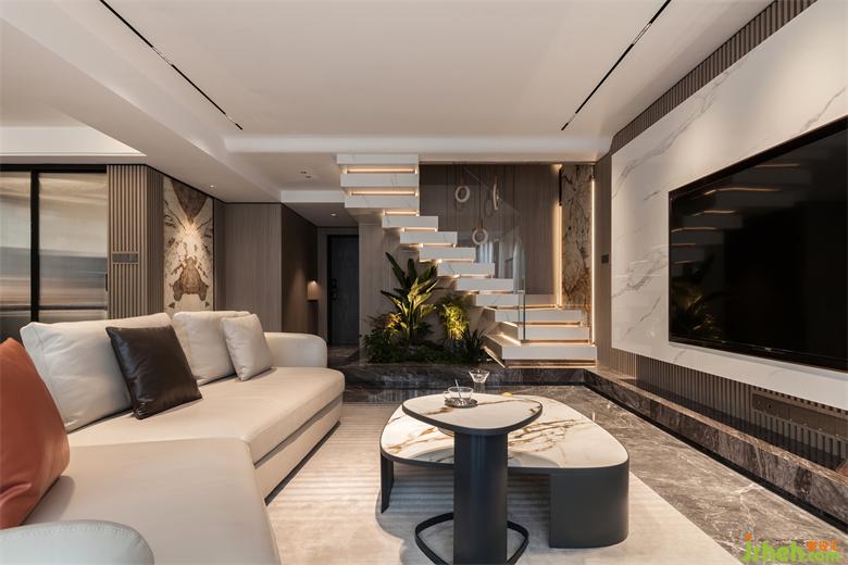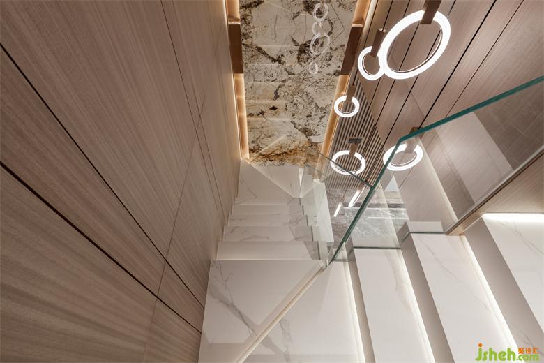 極具質(zhì)感的大理石,精致的金屬線條,高光木飾面板,皮革,絨布,巧妙的搭配,打造出一個(gè)舒適、簡(jiǎn)練、奢華、溫馨、明亮的居住空間。一樓主要作為休閑娛樂(lè)的區(qū)域,在設(shè)計(jì)上,我們更多的去打開空間,讓整個(gè)空間更具靈動(dòng)。對(duì)于復(fù)式樓來(lái)講,樓梯是設(shè)計(jì)的核心位置,通過(guò)對(duì)空間大膽的改造,合理的打造出精美的懸浮式樓梯。巖板作為當(dāng)下的主流,極致的質(zhì)感追求,盡顯他的與眾不同,在背景墻、樓梯、吧臺(tái)等位置巧妙的運(yùn)用,通過(guò)局部精致的金屬線條的合理搭配,共同打造空間質(zhì)感。 染色墻板的結(jié)合給空間增添了許多溫度,更有家的溫馨。地面采用了灰色大理石,自然的紋理給了更多想象的空間。局部奢石的點(diǎn)綴更給空間增加了奢華感。在于空間的設(shè)計(jì)當(dāng)中,簡(jiǎn)的存在主要體現(xiàn)在吊頂上面,在當(dāng)下的時(shí)代,生活節(jié)奏的加快,人們對(duì)于簡(jiǎn)的追求更加的強(qiáng)烈,在設(shè)計(jì)的過(guò)程中簡(jiǎn)與奢的結(jié)合,使得空間更具漲性。