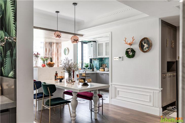 餐廳地面,直鋪實木多層地板,與廚房六邊形拼花地磚自然無縫銜接。