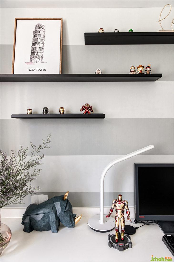 這里也是男主人的游戲娛樂室,業(yè)主喜歡游戲和收藏,設(shè)置了層次錯(cuò)落豐富的置物架,展示著這些可愛的小物件。