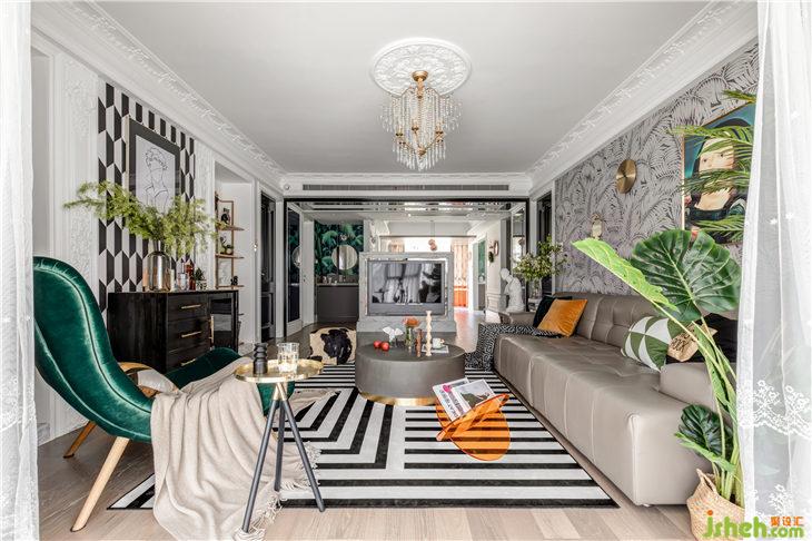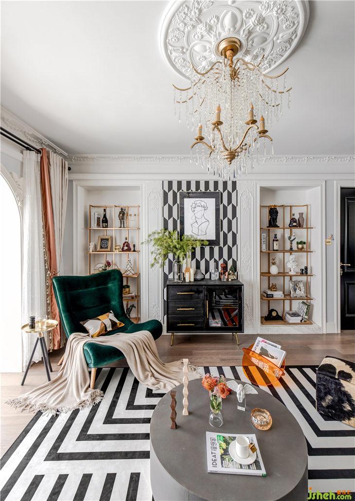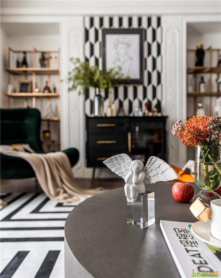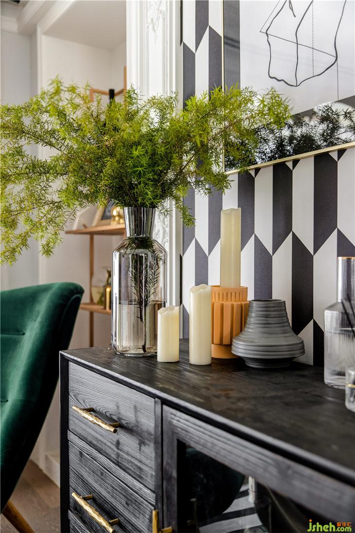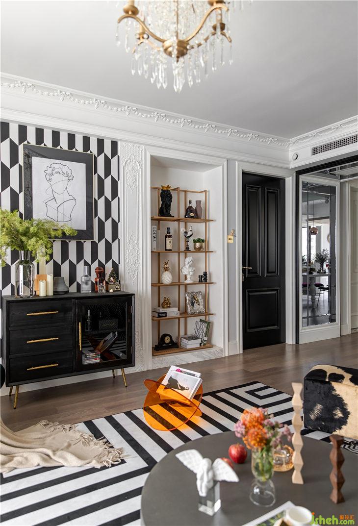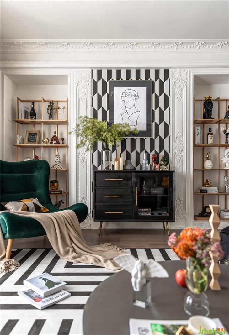 中間是英國(guó)Cole&Son 進(jìn)口墻紙幾何圖案 型號(hào)是:黑白色 105/12050,與黑白條紋的地毯琴瑟和鳴,中間的大衛(wèi)簡(jiǎn)筆藝術(shù)畫,香檳色的畫框,提升了這面背景的藝術(shù)氣息。黑色復(fù)古邊柜沉穩(wěn)不張揚(yáng),沉淀了客廳的摩登氣質(zhì)。