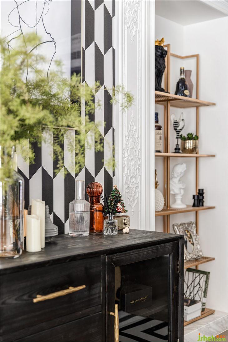 與主臥相連的這道墻進(jìn)行了凹凸組合,凹進(jìn)去的空間,正好抬高做兩個(gè)內(nèi)嵌壁龕,放置金屬展架,業(yè)主很多心愛(ài)的小擺件,和出去旅游淘回來(lái)的軟裝,名品酒水,組合成列,也成為客廳的一道獨(dú)特的風(fēng)景線。