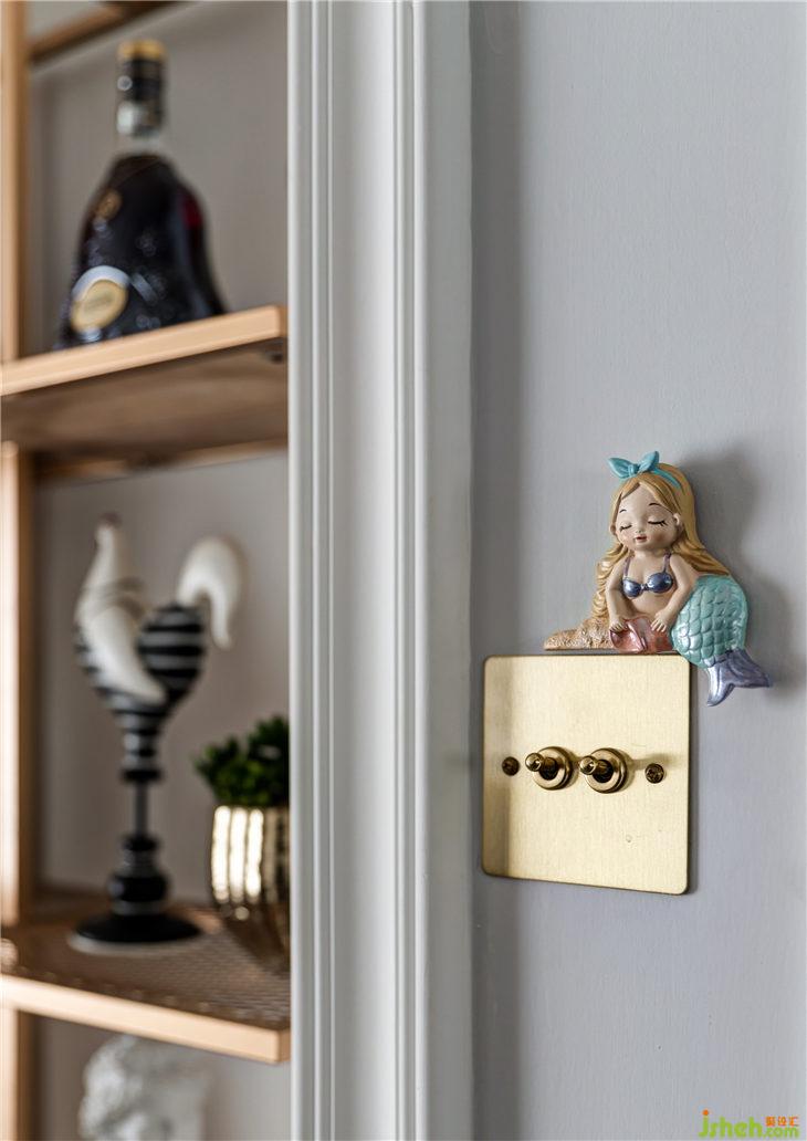 黃銅的開關(guān)面板上是我們業(yè)主自己購買的美人魚裝飾,每個造型都不一樣,安靜的呆在那里,就像家里多了幾個可愛的小精靈,生動又美麗。