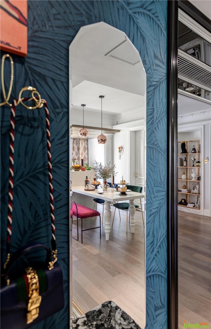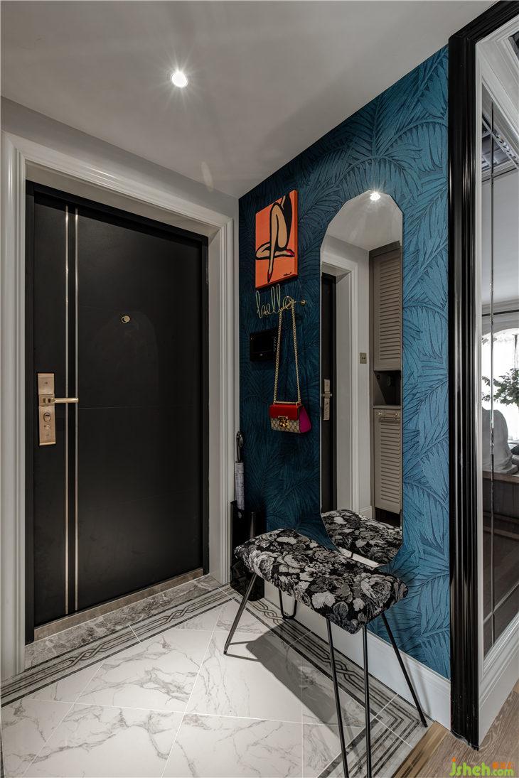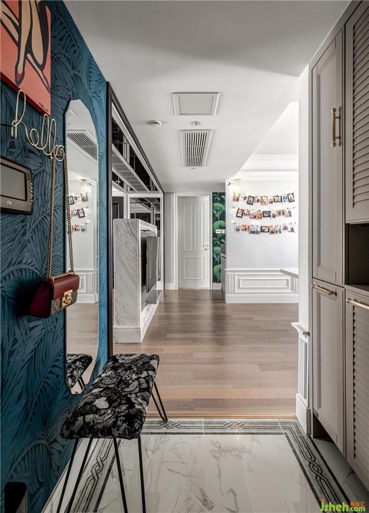 開門入戶,時尚混搭氣息撲面而來,左手邊是比利時arte進口墻紙,圖紋是熱帶雨林的葉子,深藍的靜謐與凹凸有致的紋理搭配時尚跳色掛畫,金色英文字母“hello”掛鉤,右邊棱角分明的全身鏡,地面是經典法式花紋圍邊,右邊扣線門板加百葉門板的組合配上精致復古的把手,野獸派獨特花紋的細腿長凳,每一個細節(jié)都將精美質感伶俐體現,一個時尚復古的混搭之家,就這樣映入眼簾……
