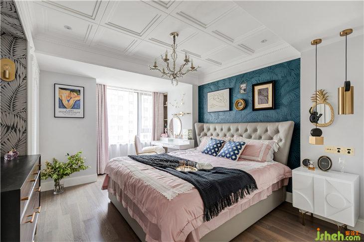 床背景內嵌的壁紙,則與入戶玄關呼應了起來,床頭組合畫有現代抽象的,也有復古精致的,還有業(yè)主自己的照片與金屬掛框進行組合搭配,用心而又獨特。