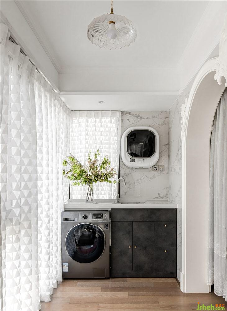 晾曬區(qū)對面是壁掛的小洗衣機和一體化洗衣池,墻面是魚肚白紋理瓷磚,門板是復古的仿巖板材質,將功能區(qū)也很好的融入了半開放的客廳空間。