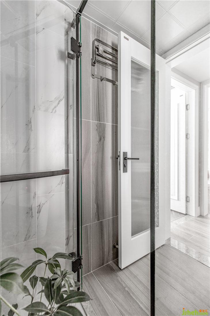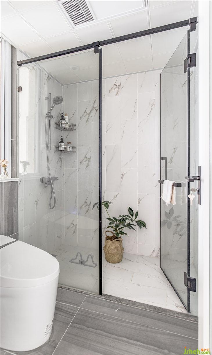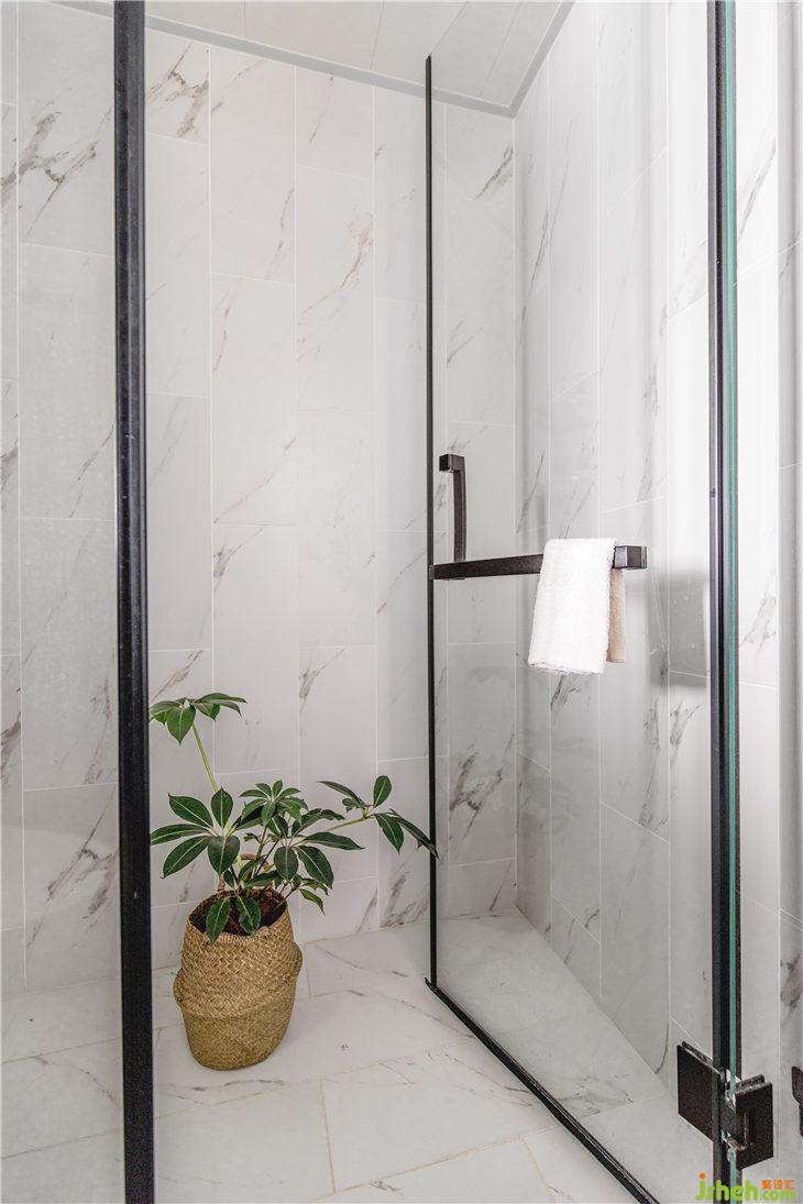 衛(wèi)生間運(yùn)用兩種瓷磚的大面積鋪貼來(lái)分割空間,淋浴間用瓷磚豎鋪工字磚貼法,順延到地面,干凈整體。