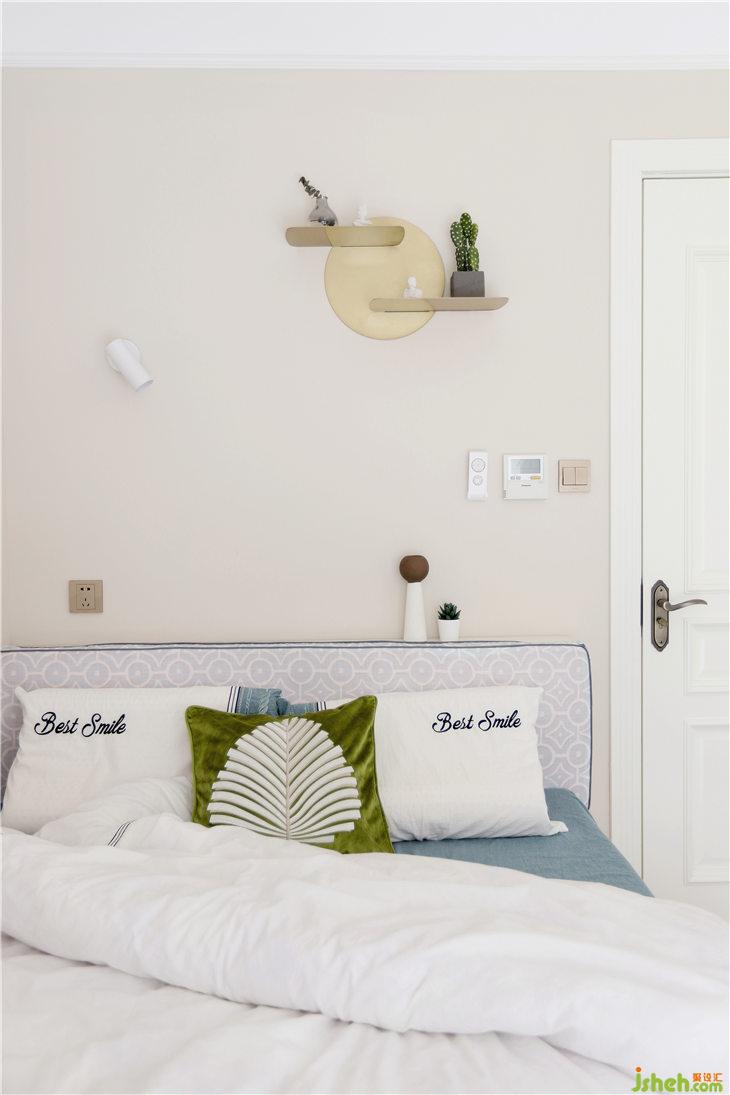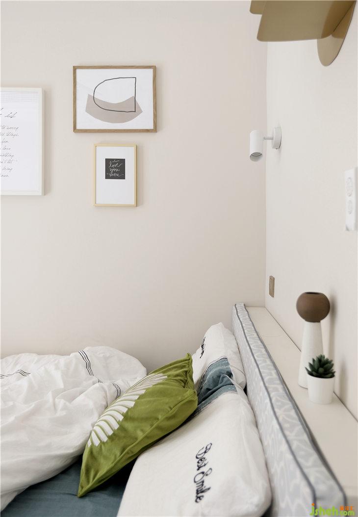 次臥空間不大,與南陽臺相同,采光充裕。放置了一米五的床,定制了一個窄衣柜,就已經(jīng)充滿了房間;因此我們墻面選用了清新淡雅的白鷺色乳膠漆,搭配暴風(fēng)雨灰色系床品,點綴雪松綠抱枕,讓空間盡量的明亮清爽,單配精選的墻面掛飾和吊扇燈,簡約而又富有生活趣味。